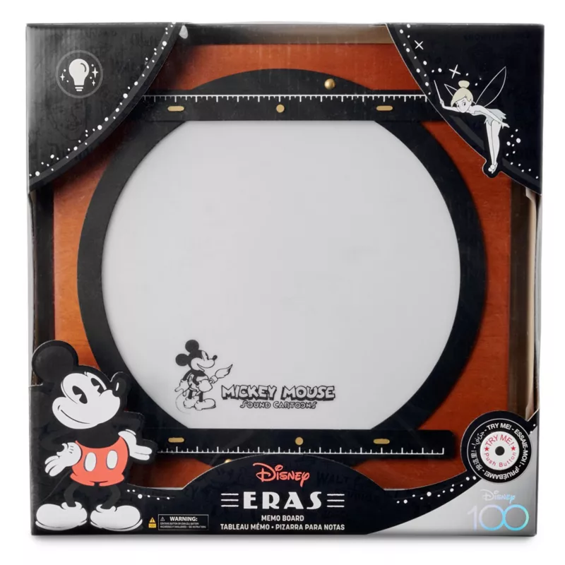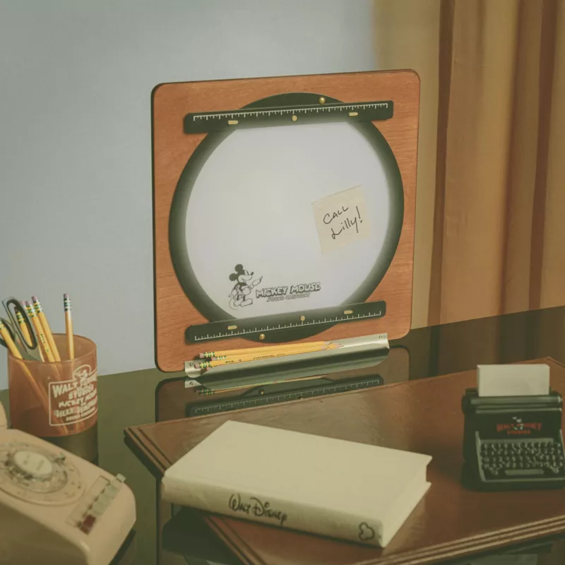 Make a nifty note to yourself or others on this light-up memo board in the form of the disc from a traditional animator’s drawing desk as found at the Walt Disney Studios. Use a dry-erase marker (not included) to make your statement–or draw a cartoon! Wipe and begin again. Features classic Mickey illustration.