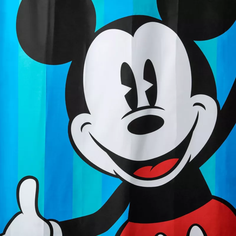 Mickey will add plenty of character to your bathroom with this shower curtain. His large personality is captured in the outsized image of a smiling and waving Mickey that contrasts with this colourful striped design.