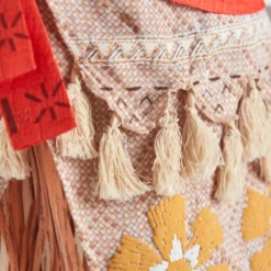 - Overlapping top panel with zig zag hem, tassels, and raised puff ink screen art