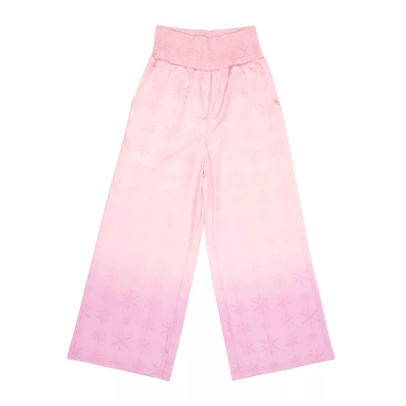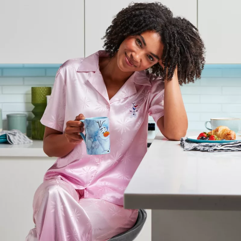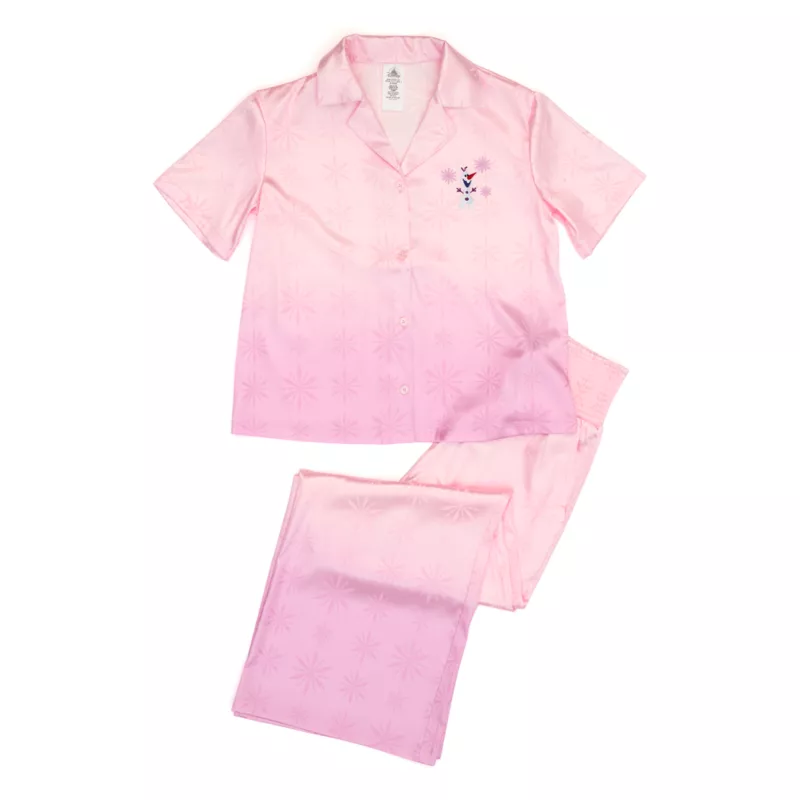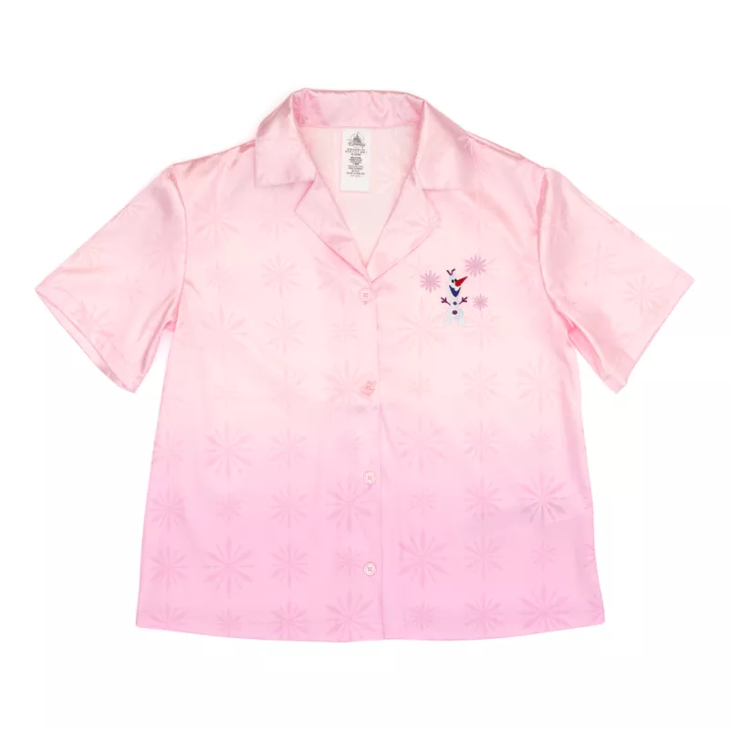 Whatever the weather, this satin jacquard Olaf sleep set is luxurious and fun any time of year. Everyone’s favorite snowman is screen printed on the button-down shirt. The allover snowflake print adds to its brrr-illiance. Inspired by Disney’s Frozen, these pretty pink pajamas look as great as they feel.