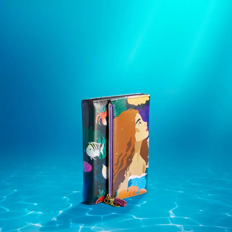 - Outside of trifold case has colourful aquatic print featuring Ariel